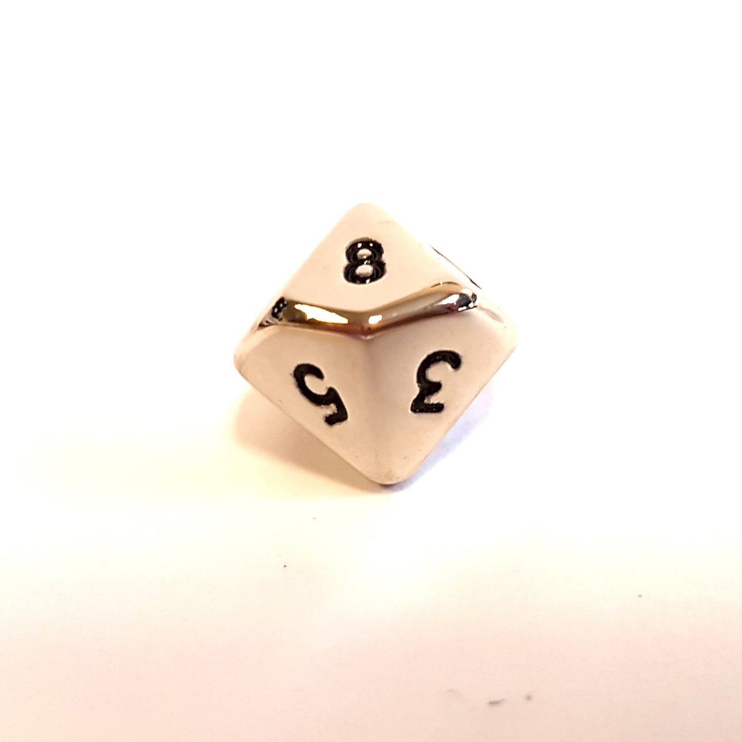 A mini D10 dice in a Chrome finish approximately 10mm in size.