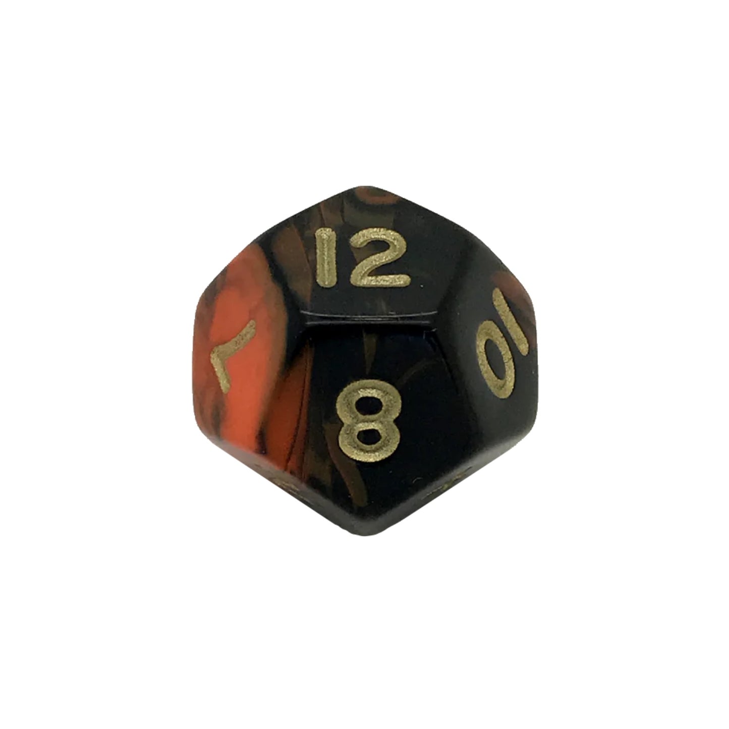 Oblivion orange D12 (12 sided) poly dice with gold digits