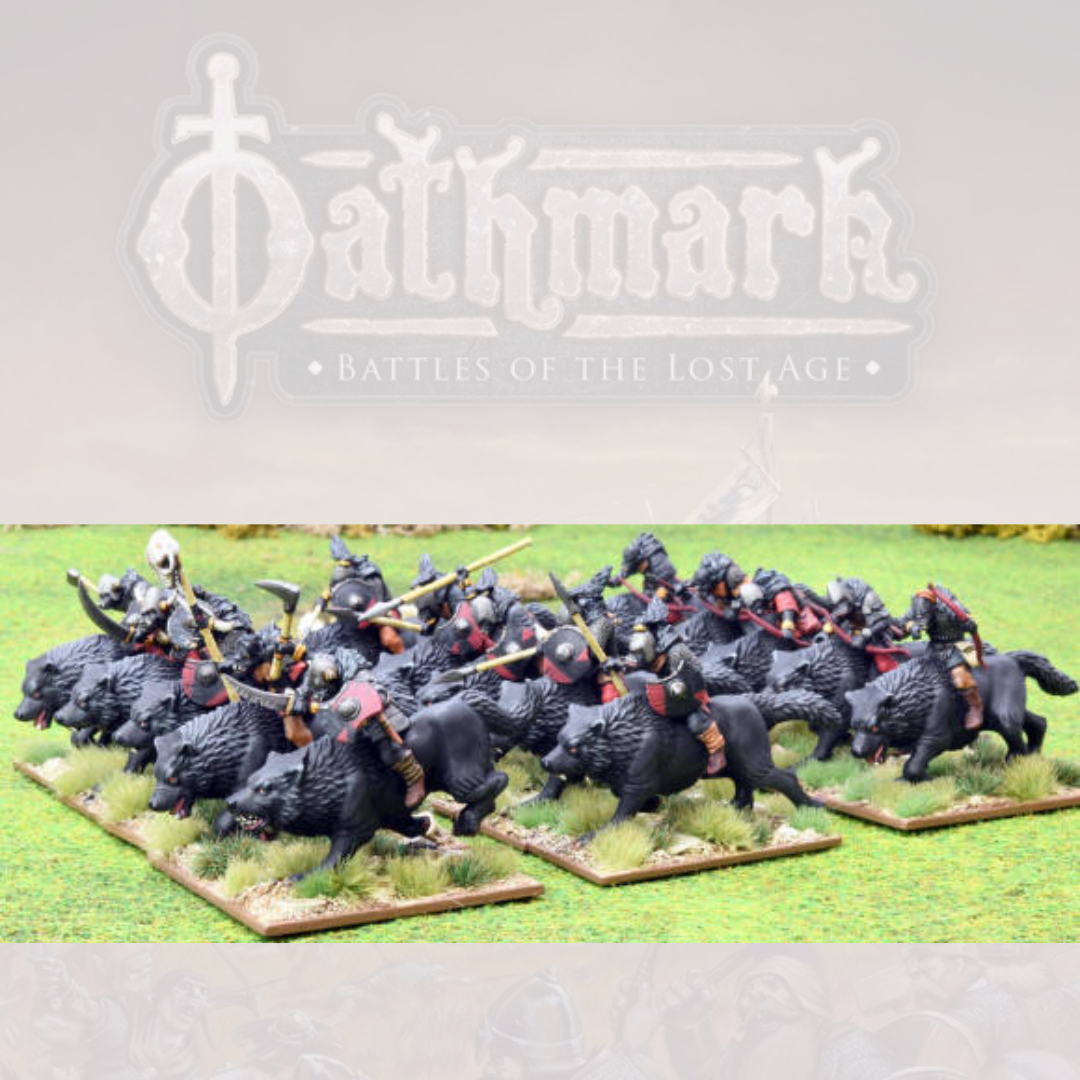 Plastic 28mm sized Goblin Wolf Riders, designed to be used in the Fantasy Mass Battle game Oathmark: Battles of the Lost Age from Osprey Games.