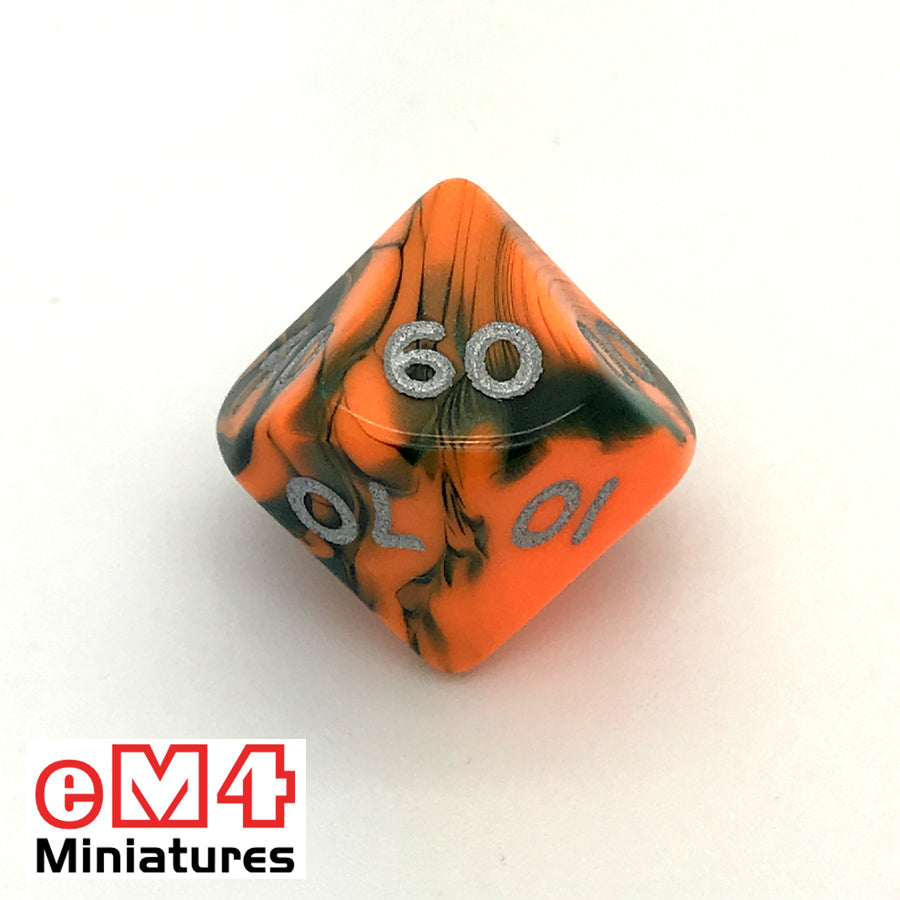 Toxic chemical (orange & green) D10 (10 sided) percentile 00-90 poly dice with silver digits